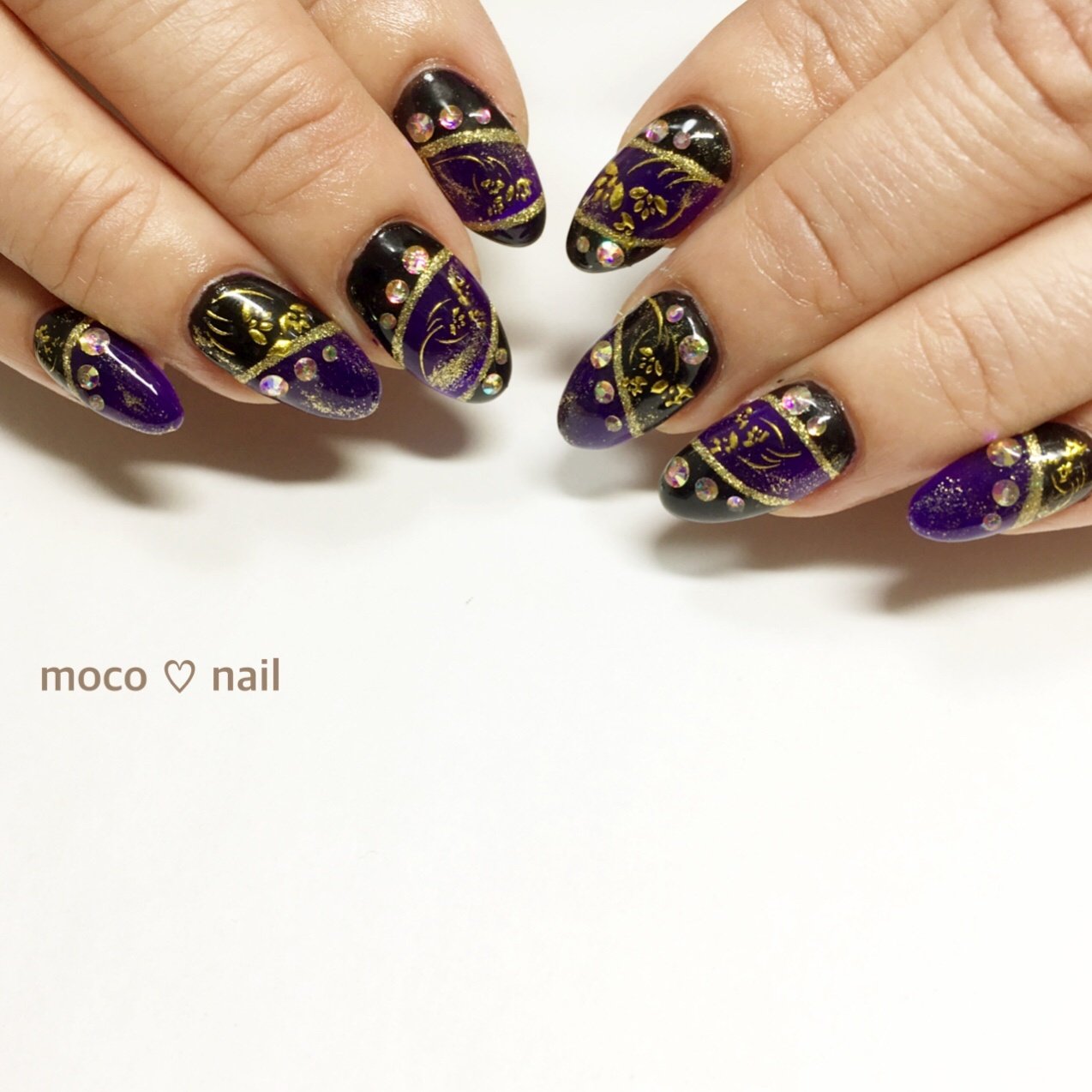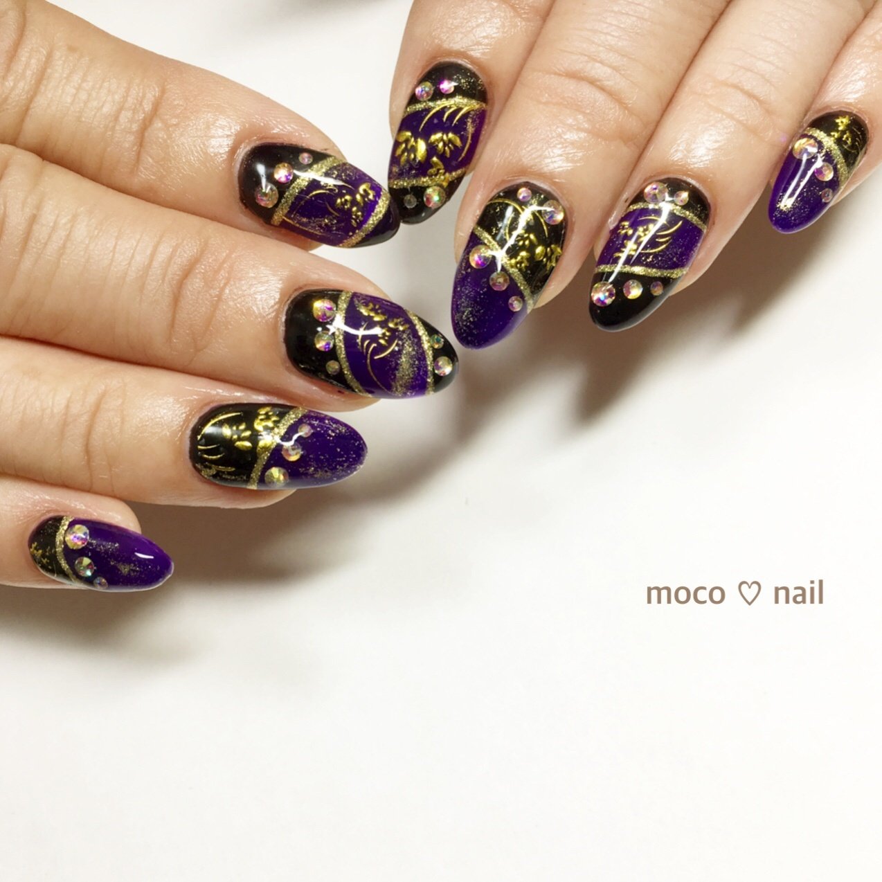 ロングスカルプ 紫 黒 Vカットストーン デカリングパーツ 倉吉ネイル