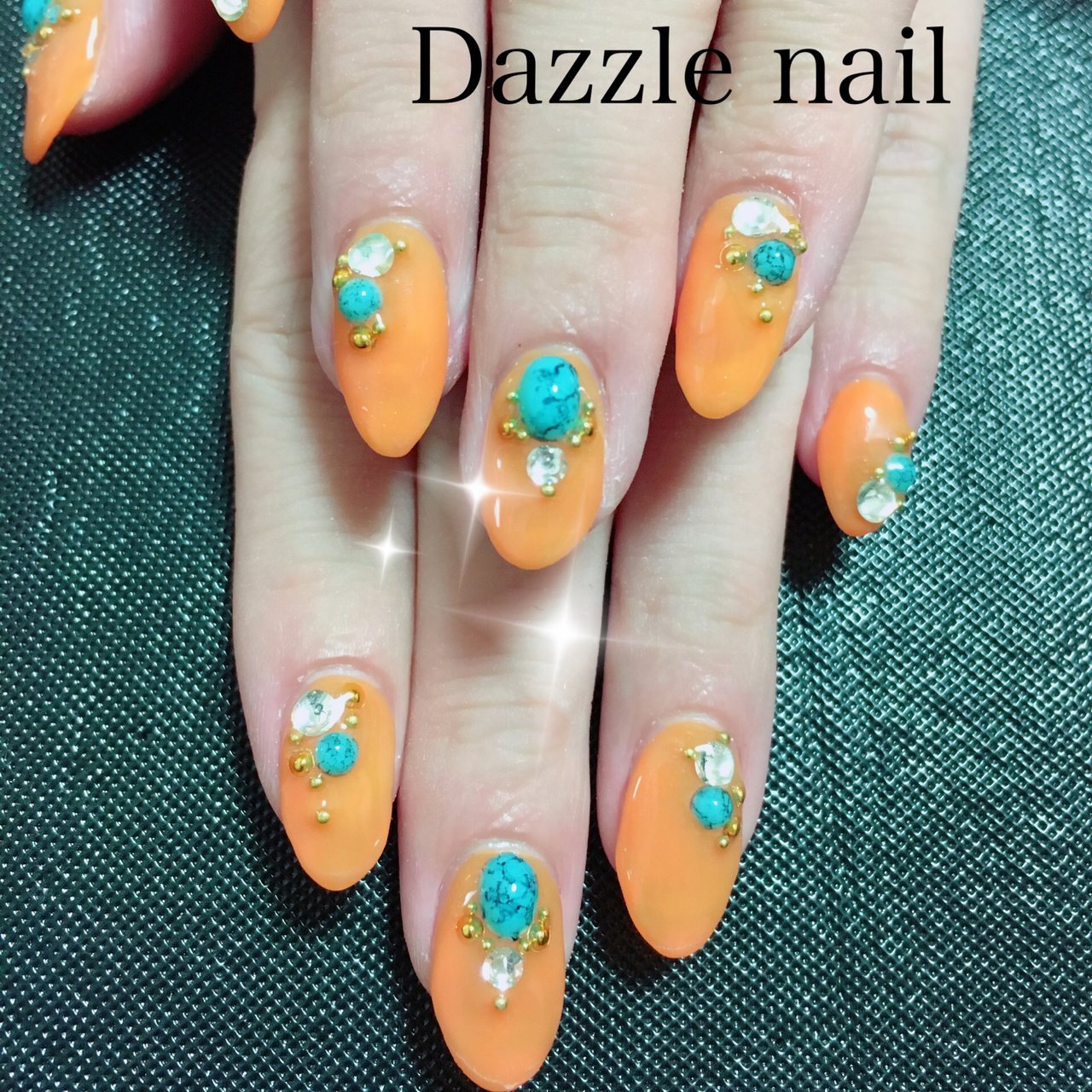 天然石 ホワイトターコイズ風 夏 オレンジ エスニック風ネイル