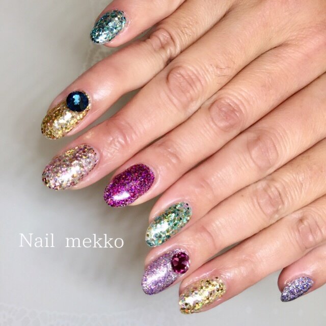 ラメ ビジュー ゴールド シルバー カラフル Nail Mekkoのネイル