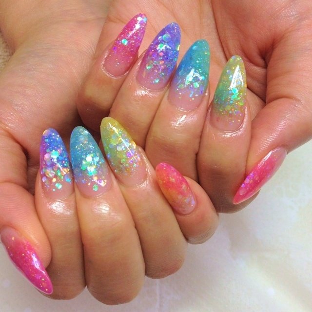 カラフルカラーのラメグラデーションネイル グローネイル ネイル グラデーションネイル
