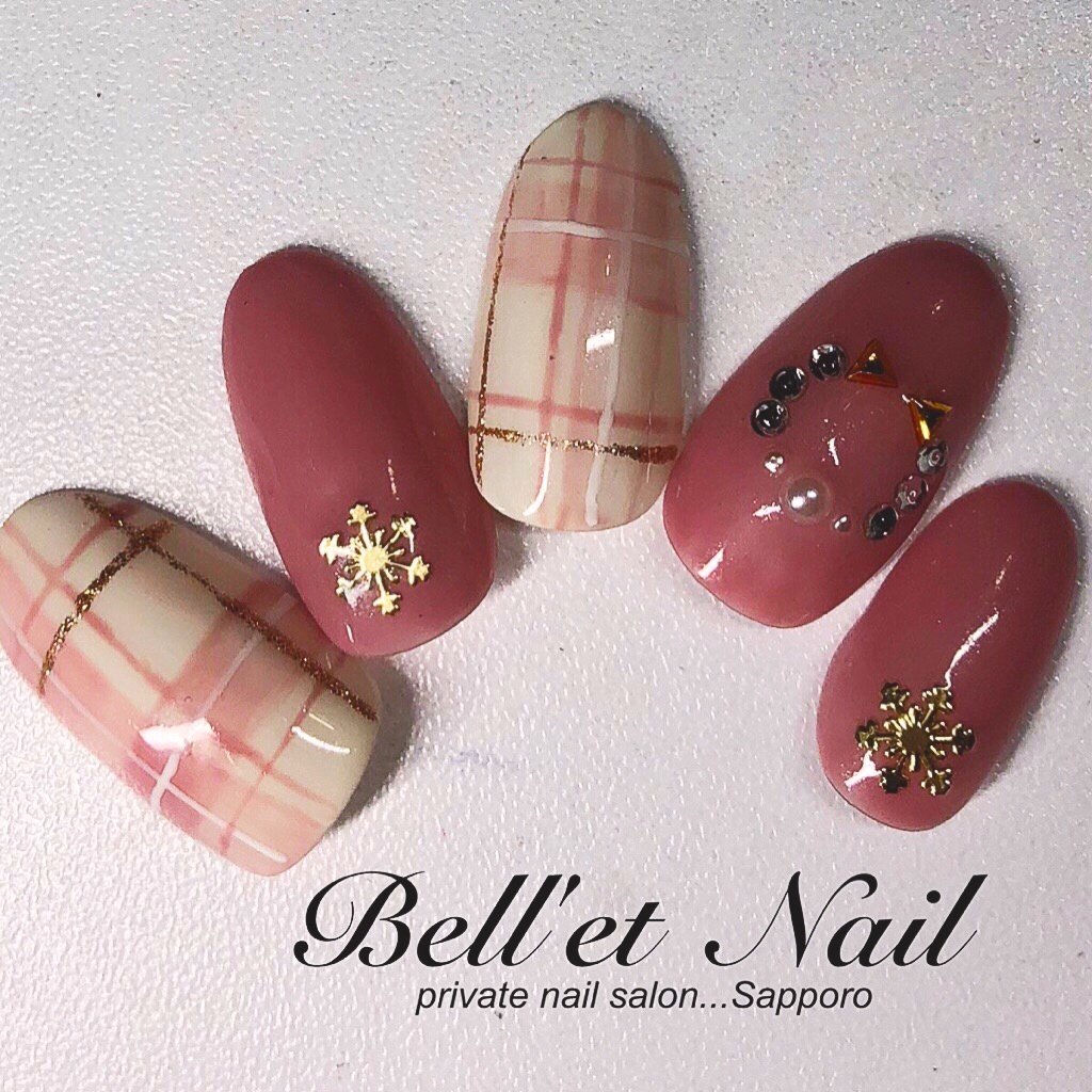新作 Xmasネイル ふんわりピンク チェック柄 スノー ネイル