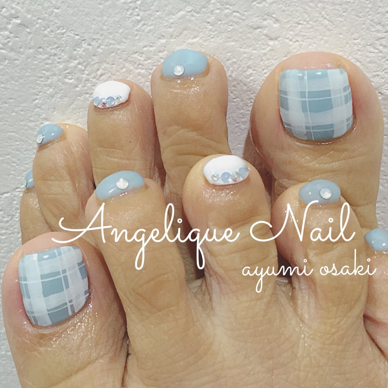 春 夏 フット チェック 水色 Angelique Nail Ayumiのネイルデザイン