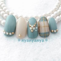 爽やかな水色チェックにゴールドチェーンでボリュームup ネイル