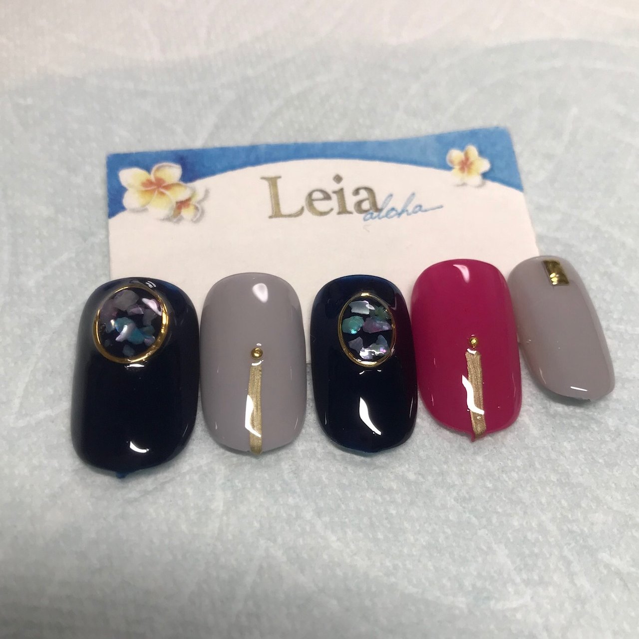ハンド シェル ピンク ネイビー グレー Leianail のネイルデザイン