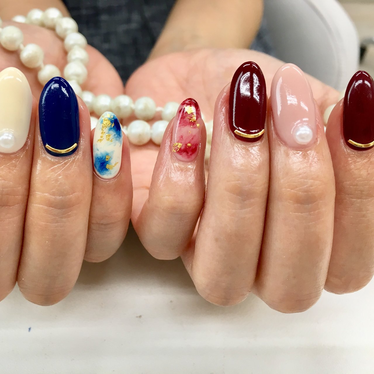 秋 ハンド タイダイ ネイビー ボルドー Lachicのネイルデザイン No