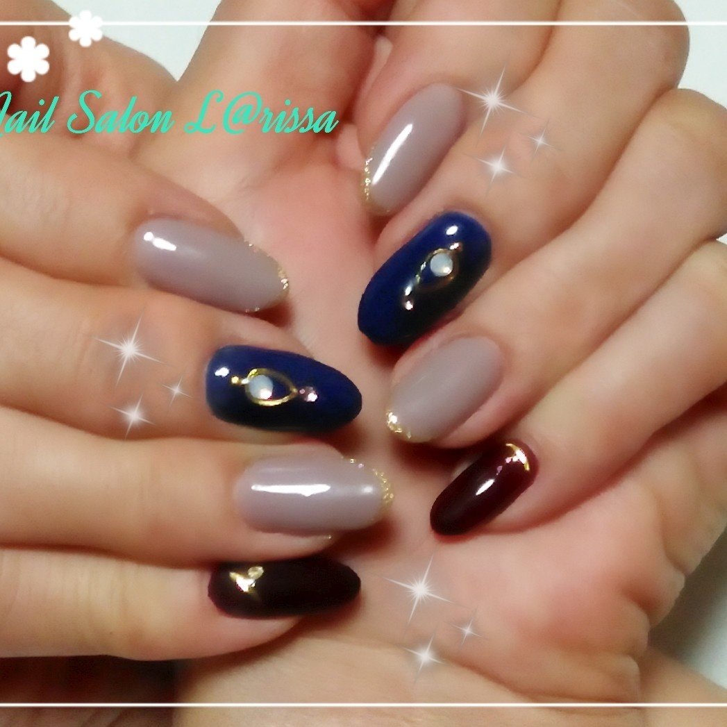 秋 ハンド ネイビー ボルドー グレージュ Larissaのネイルデザイン