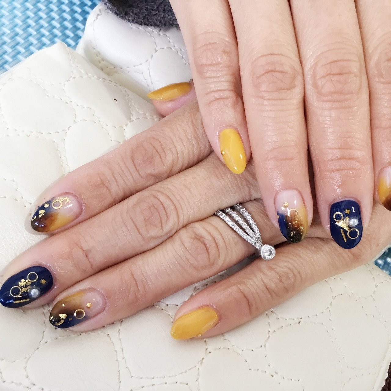 デザイン1 しずくさんデザイン マスタード 青は最強ネイル まずはじめに 今回 参考にさせていただいたしずくさんデザインはこちらです しずくさんの使っているマニキュアの色味とはかなり違いますが それでも十分かわいくないですか デザイン1 ったウィークリージェル.