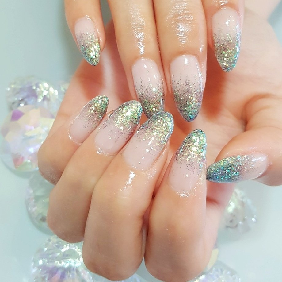 パールのラメをかければ 夏の日差しを浴びたときの表情に色っぽさが加わり 大人の余裕を感じるネイルに how to 1 爪全体にクリアホワイトのポリッシュを2度塗りする 2 1が乾かないうちに アクアブルーとパステルパープルのポリッシュを縦のグラデーションになるように塗る 3.