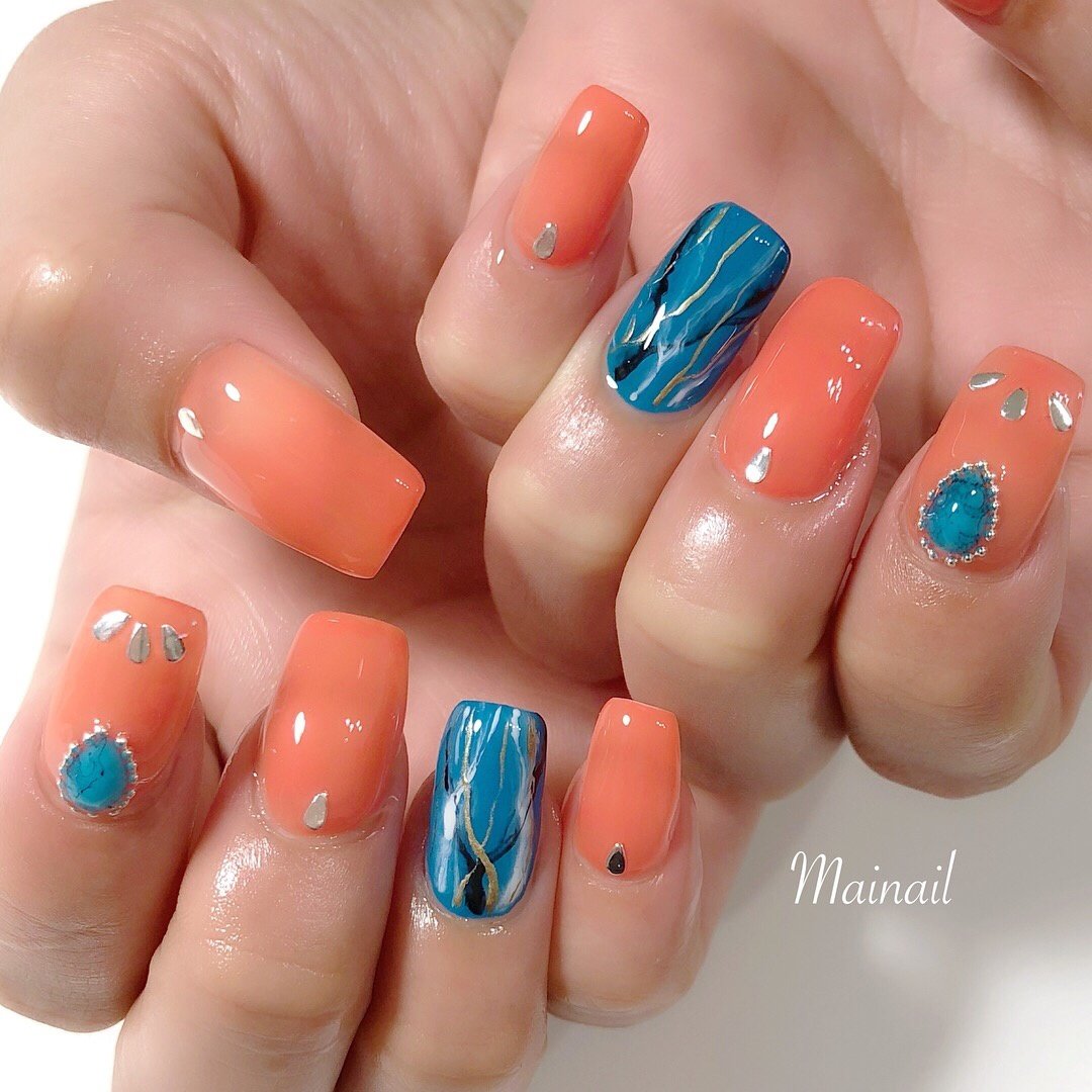 夏 ハンド オレンジ ターコイズ ブルー Mainail マイネイル のネイル