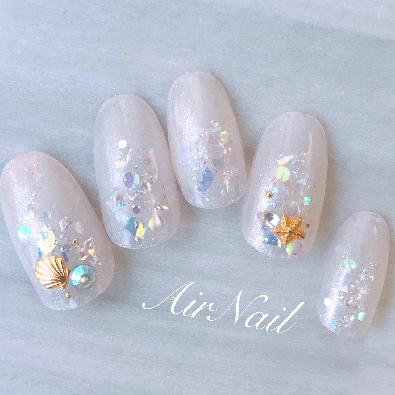 夏 海 ハンド ラメ シェル グロスマジックのネイルデザイン No