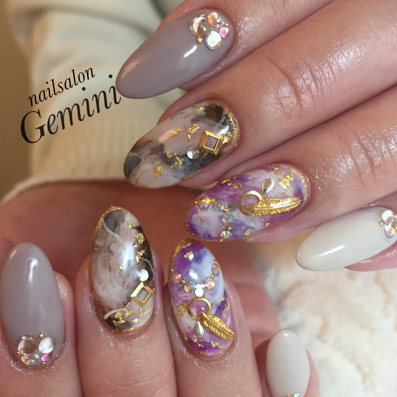 ハンド ビジュー フェザー タイダイ マーブル Asamiのネイルデザイン