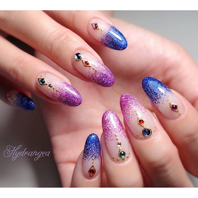 ট ইট র あすか おにゅー キラキラをラメじゃなくてパウダー使ってもっとギラギラにした 青 紫 ピンクで縦グラデにしたのもプチポイント ほんで今回もどうしても
