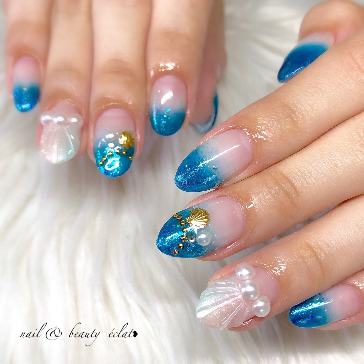 青のさわやかラメグラデーションネイル セルフネイラー向けジェル