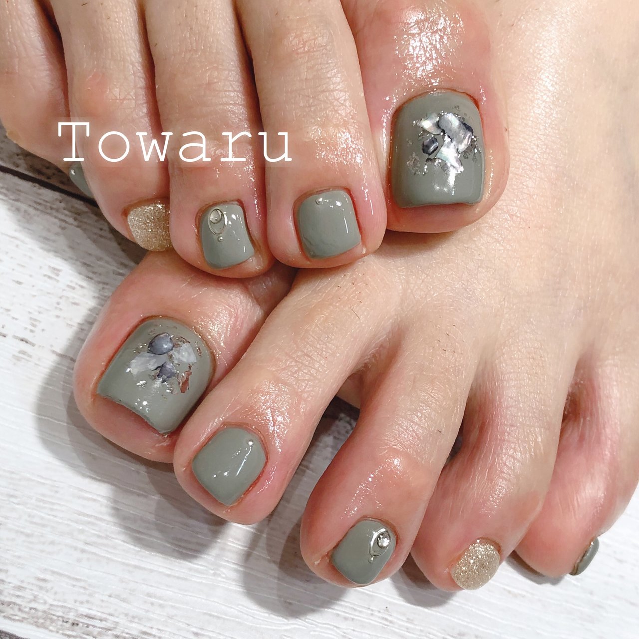 秋の人気色 カーキ を使用して 大人シンプルなフットネイル