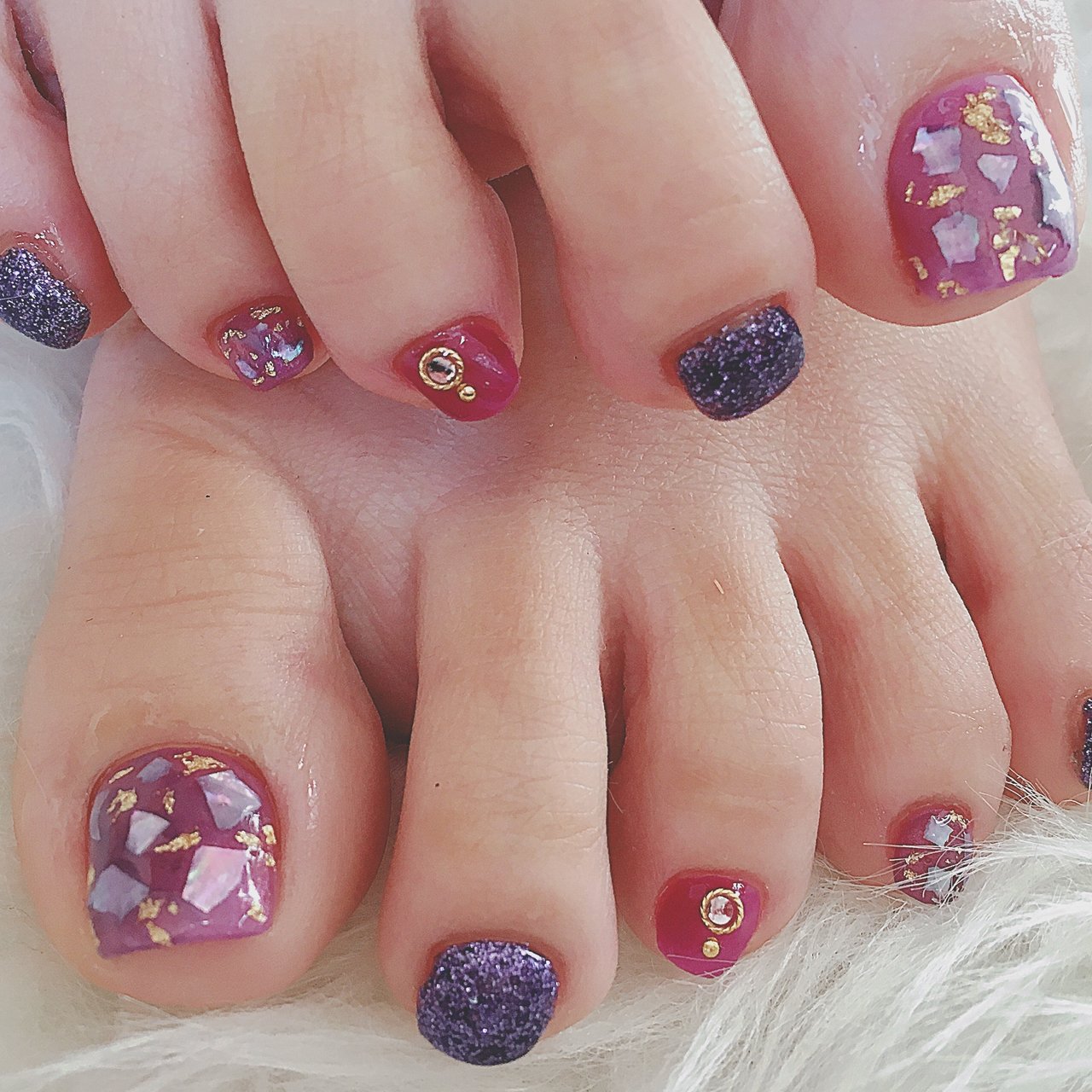 2色の紫ラメで色変えしたフットジェルネイル Nail Salon Freestyle