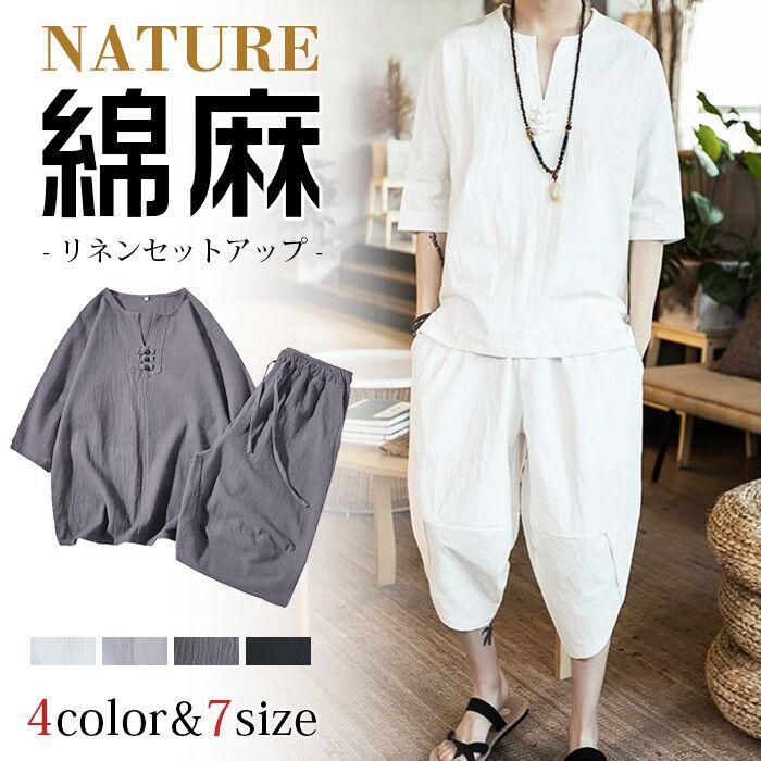 綿麻上下セット 一部当日発送 セール セットアップ リネン 夏 半袖 薄手 サルエルパンツ メンズ ワイド ルームウェア 部屋着