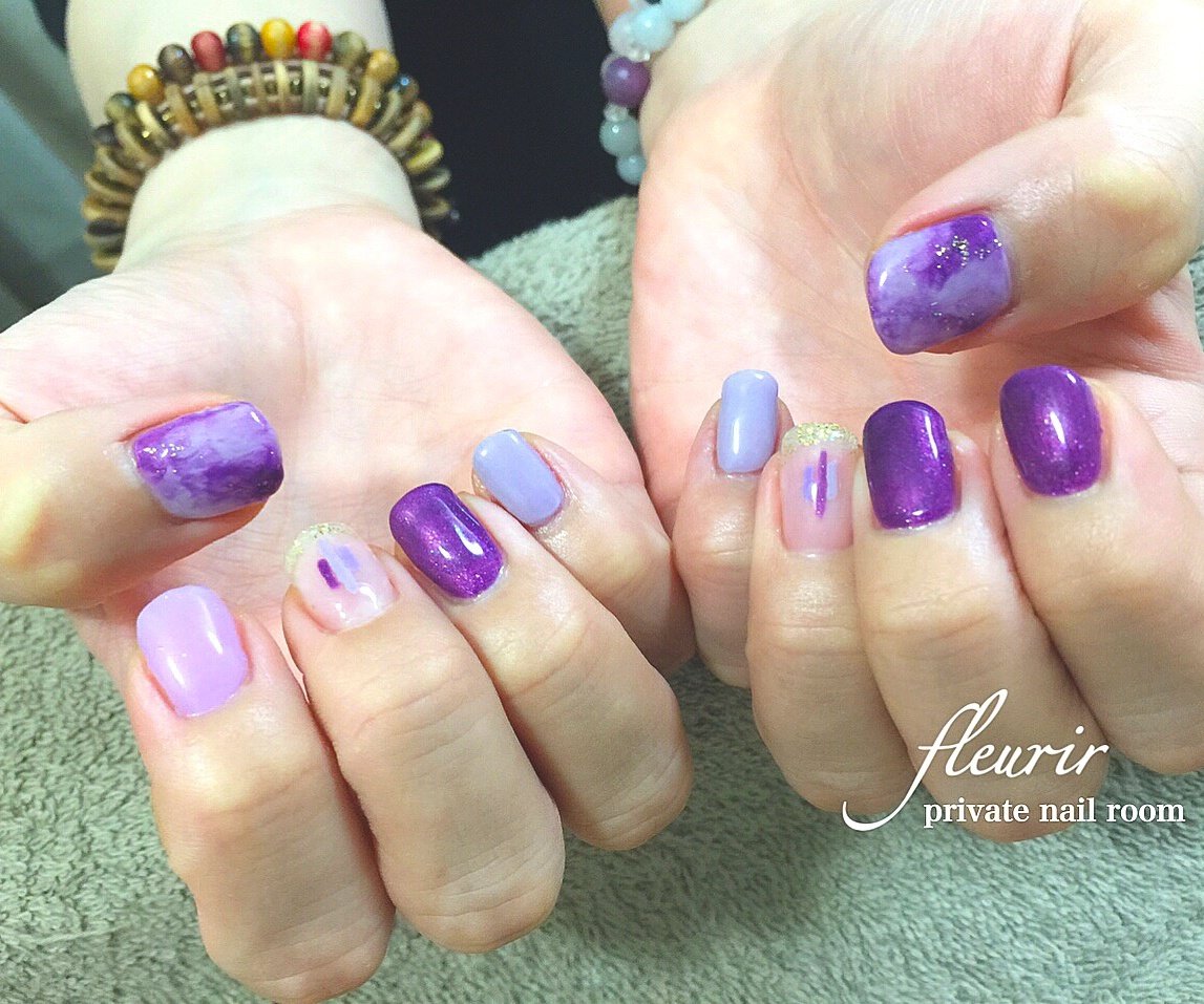 パープルネイル45選 紫に似合う色のピンク ゴールド 黒などの組み合わせ 単色やグラデーションなどパープルセルフネイル