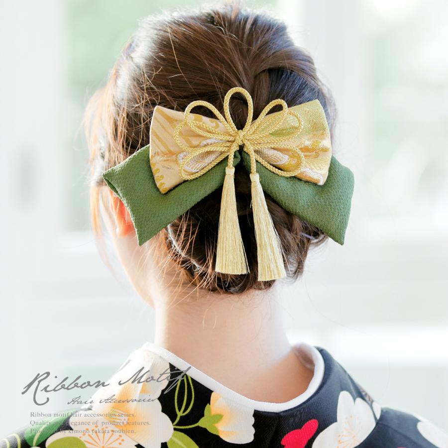 髪飾り 黄緑色 グリーン 金色 リボン 房紐飾り 金襴緞子 縮緬 ちりめん