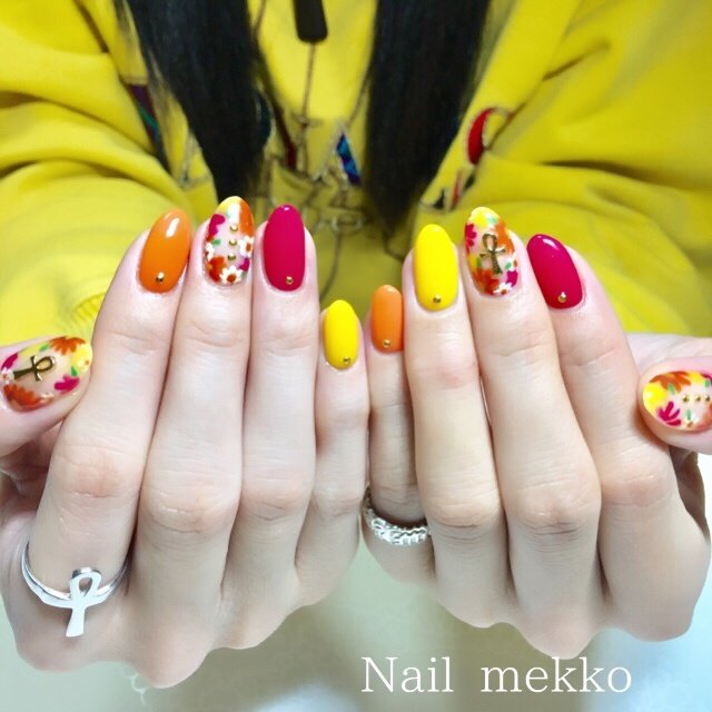 ワンカラー フラワー オレンジ イエロー カラフル Nail Mekkoの