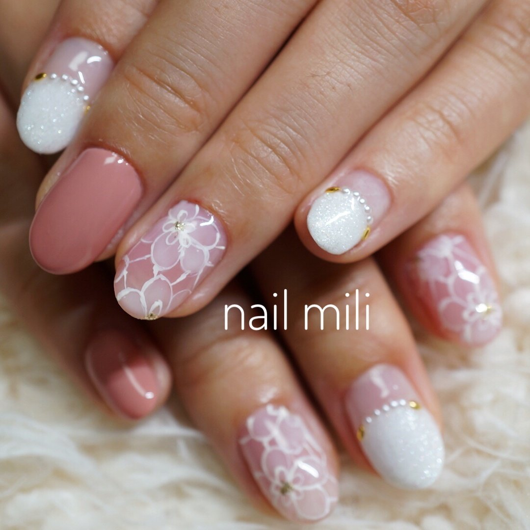 シンプルブライダルネイルのデザイン一覧 ベージュ 白 ピンク 花柄